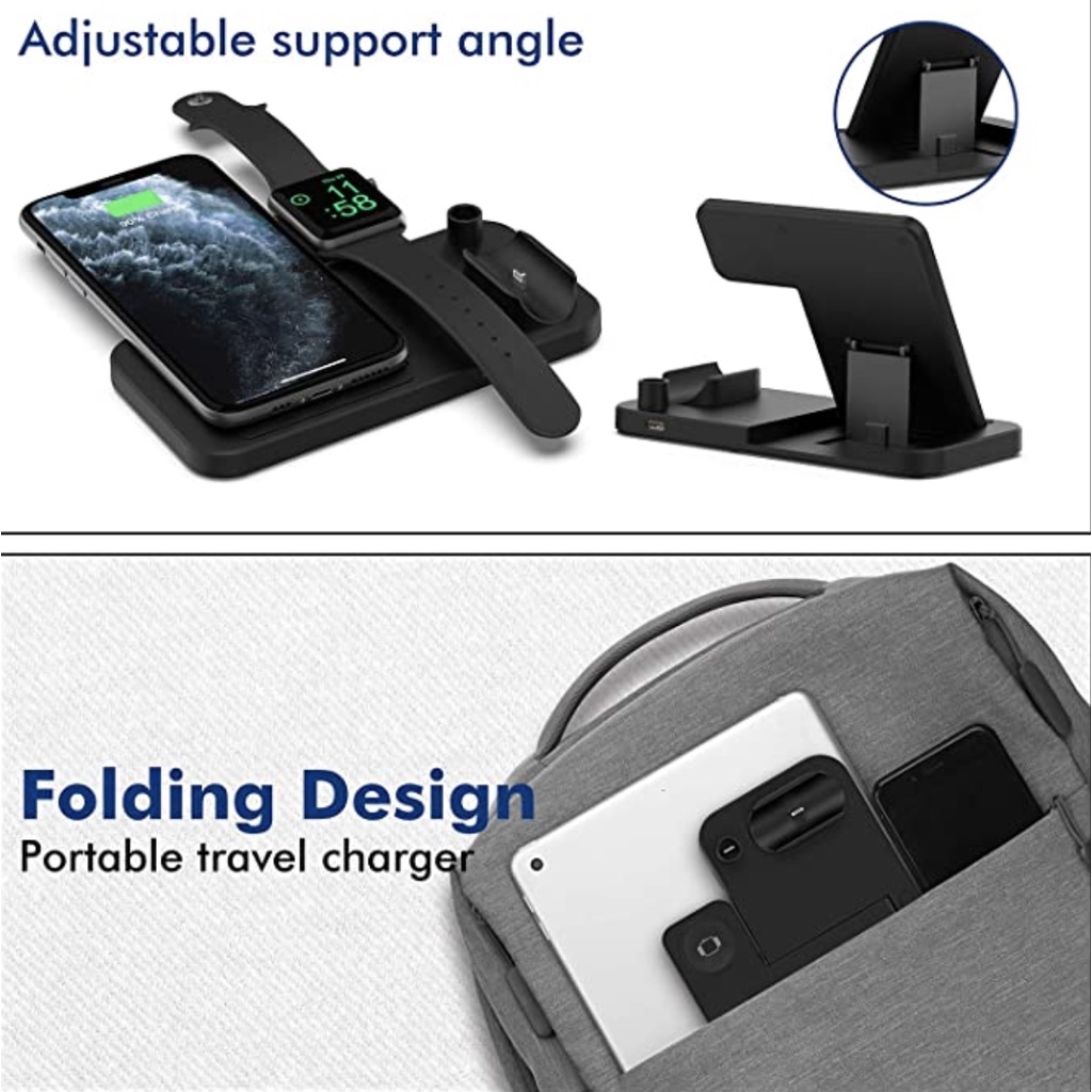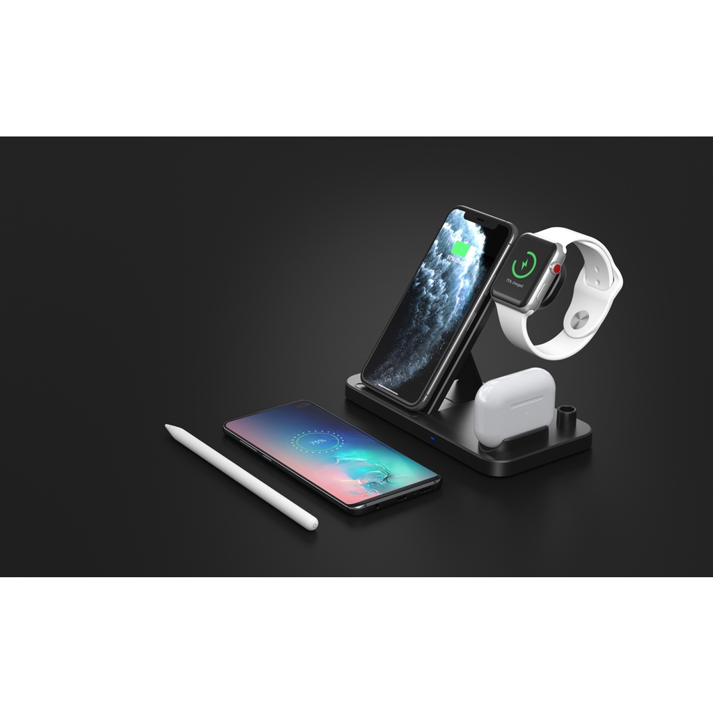 - Specifications:- Material: ABS- Input: 5V/2A, 9V/2A- Output iWatch: 2W- Output Apple Pencil: 2W- Output Airpods: 5W- Output Phone : 5W 7.5W 10W 15(Max)- Color : White/Black- Receiving Distance 2-10mm- Package: 18x15x2.5cm- Packaget Weight: 200Grams- Cable Length 1.2mWhat's in the package?- 1 x 4 in 1 QI Wireless Charging Station- 1 x Type-c USB Charging Cable- 1 x User Manual3 Months Local Warranty*Terms and conditions applied *