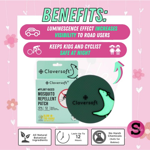 Cloversoft Mosquito Insects Repellent Patch ( Glow in the Dark) is a natural and effective way to keep you and your loved ones safe from persistent mosquitoes. Intricately formulated with safe and all-natural ingredients, the patch can provide up to 12 hours of protection from mosquitoes and garden insects (such as bees and flies). The patch is safe for young children and pregnant women. Free from Deet.