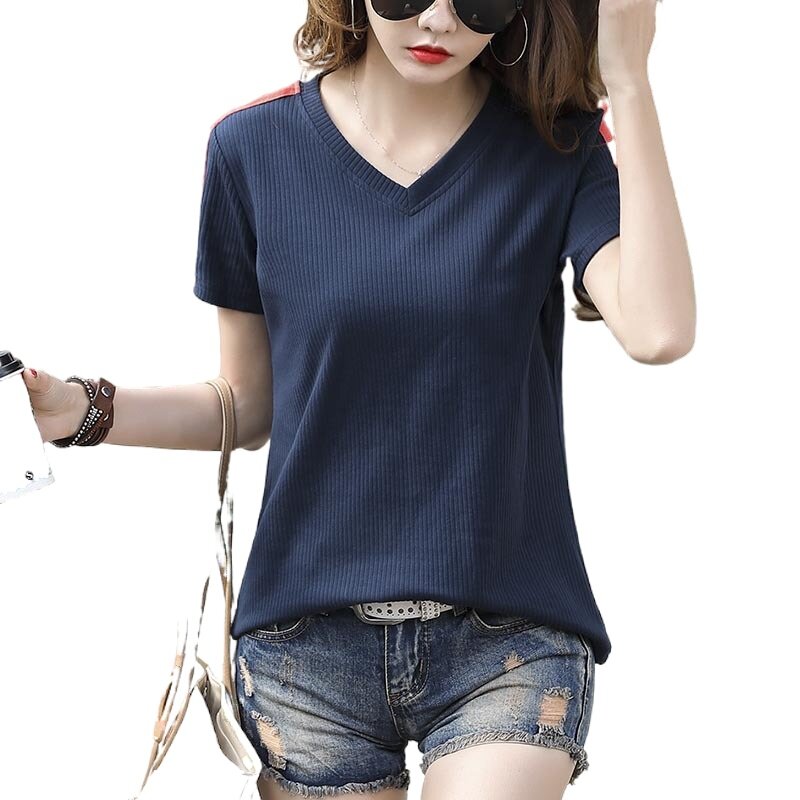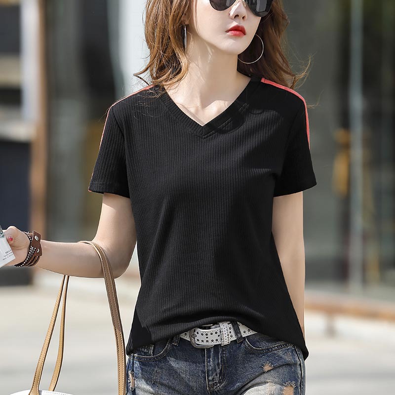 Summer Black V-neck Short-sleeved T Shirt Women's Tops 2021 New Style Wild Loose T-Shirts Slim Beautiful Blouse Cotton T-shirt Korean Style Clothes for Women Clothing