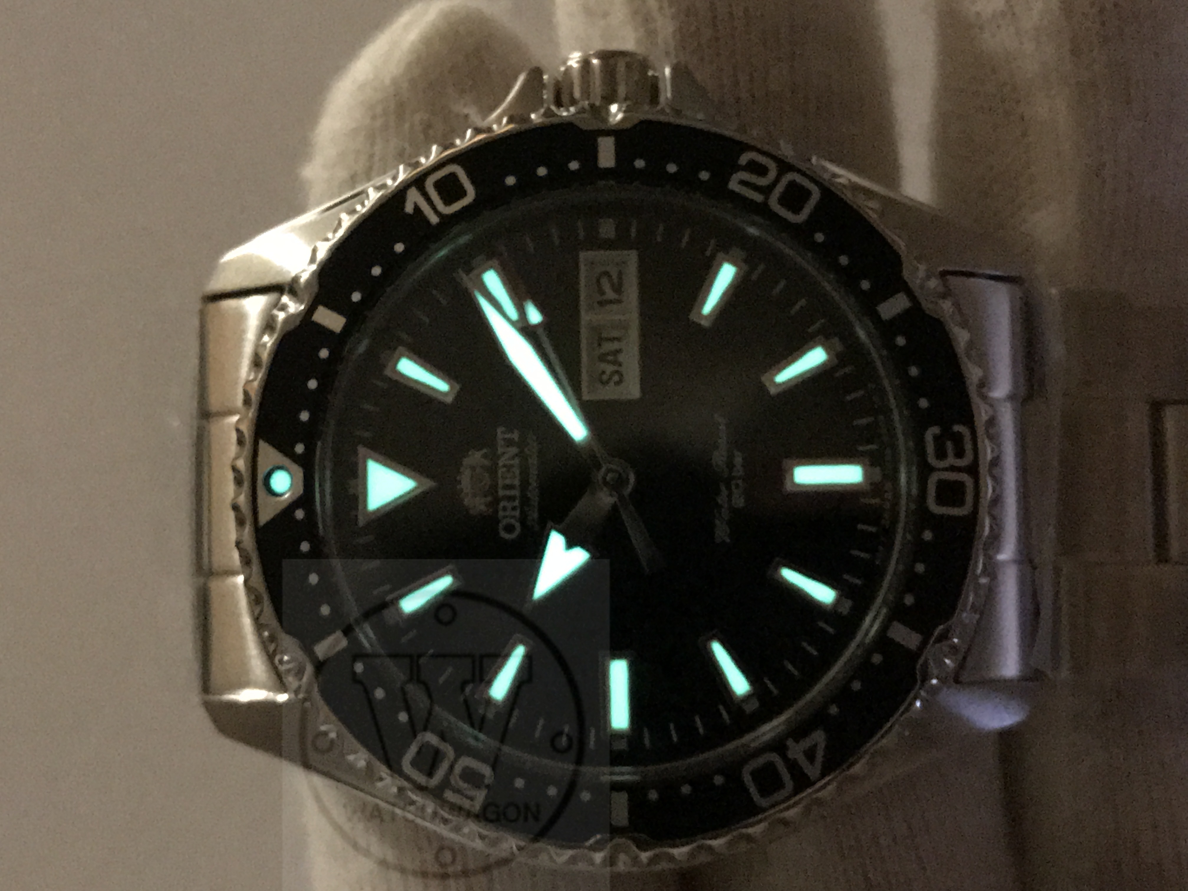 Black dial with luminous silver outlined hour/minute/second hands and markers.