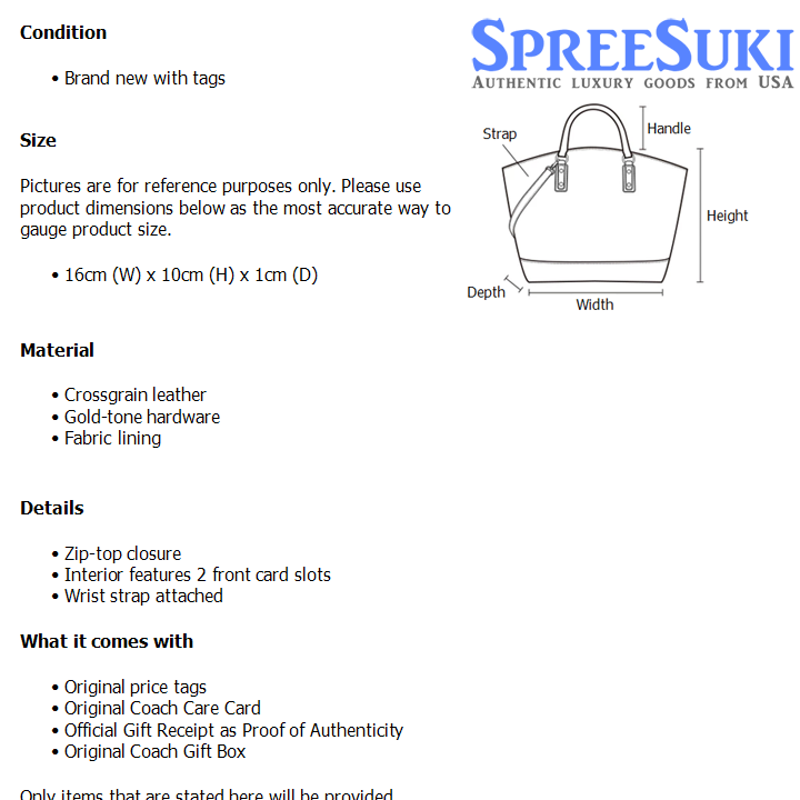 All our products are 100% authentic and purchased from Coach stores in USA. We are a reputable registered business in Singapore and it is illegal to sell counterfeit goods in Singapore. This product also comes with a gift receipt which is printed by the Coach store that we purchased the item from. It states the item that we purchased and the Coach store that it was purchased from, proving the authenticity of the item. Buy with confidence.