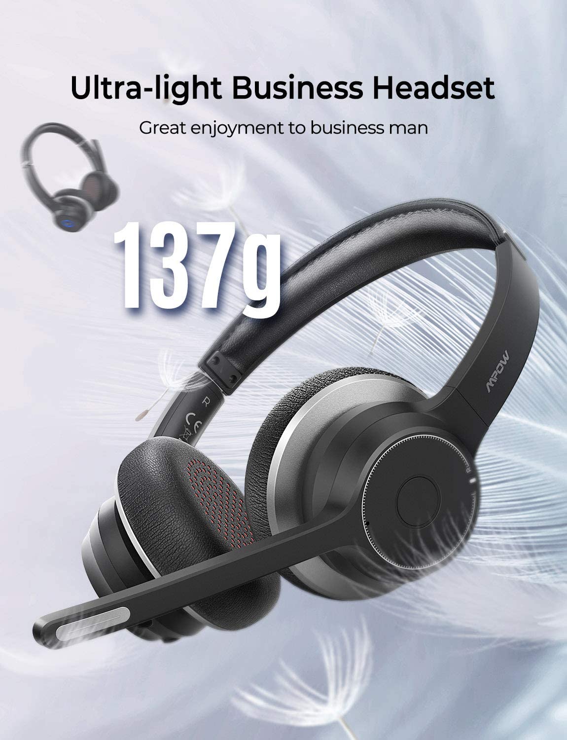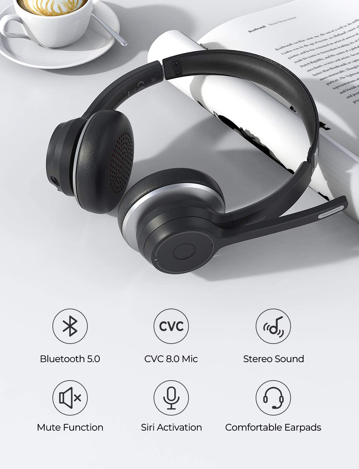[Mpow] HC5 Wireless and Wired Headset with Dual Microphone, Bluetooth headset 5.0 with CVC 8.0 Noise Canceling Microphone, 22Hrs Talk Time, Comfort Earmuff, Handsfree Wireless Headphone with Mute for