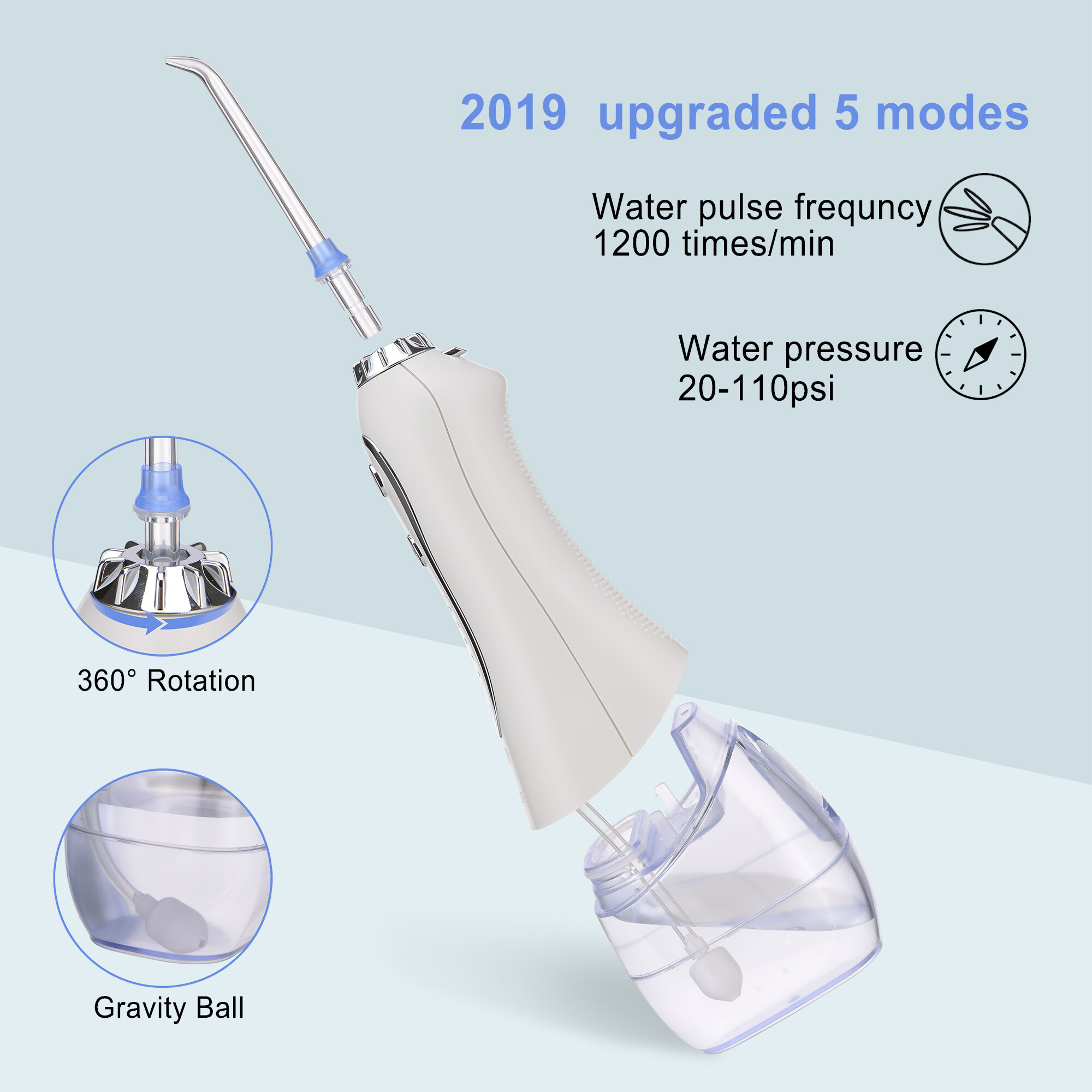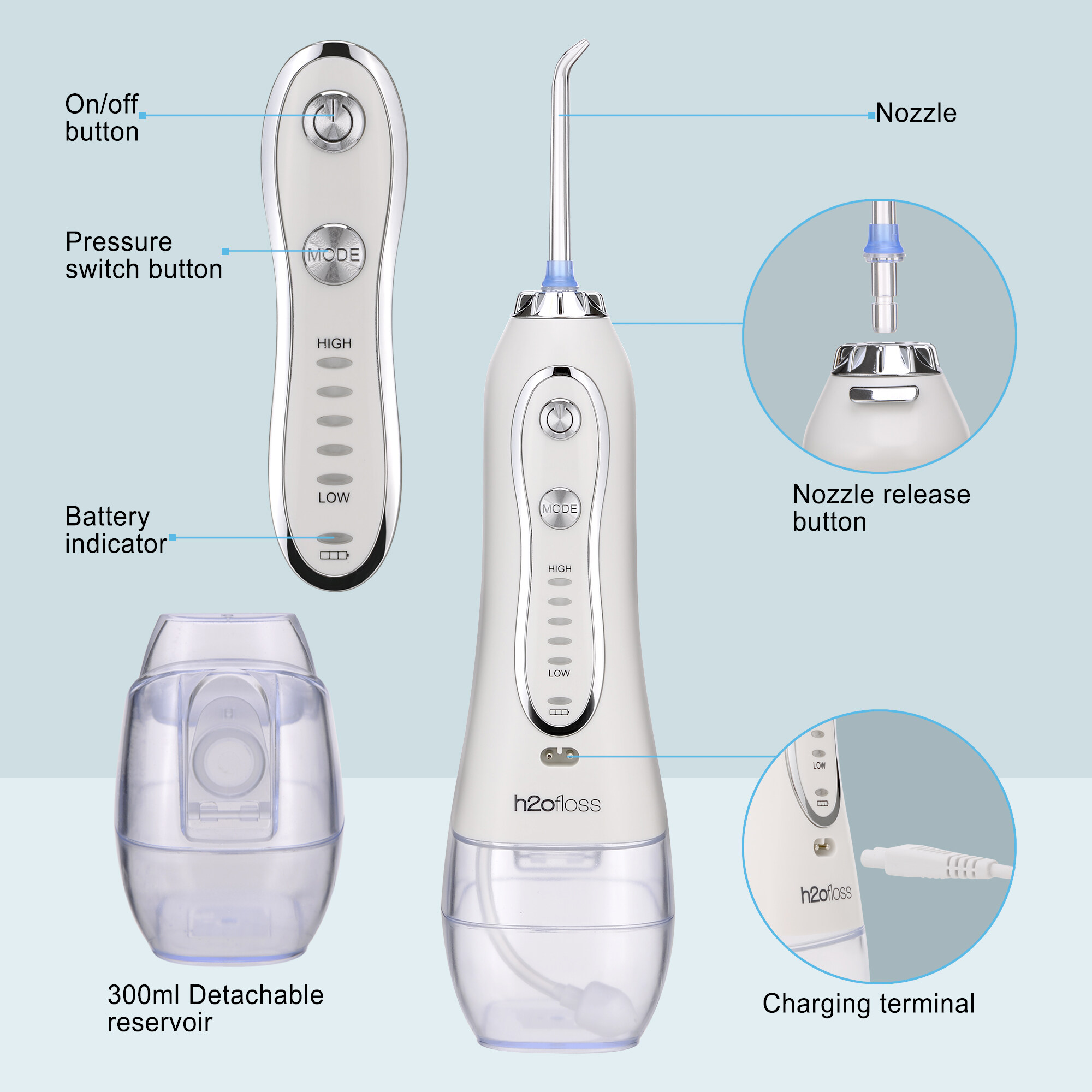 H2ofloss Portable Oral Dental Irrigator Cordless Wate Flosser Waterproof Teeth Cleaner with 5 Modes 5 Jets Tips and 300ml Detachable Reservoir Rechargeable Dental Flosser for Brace Bridges Care, Home