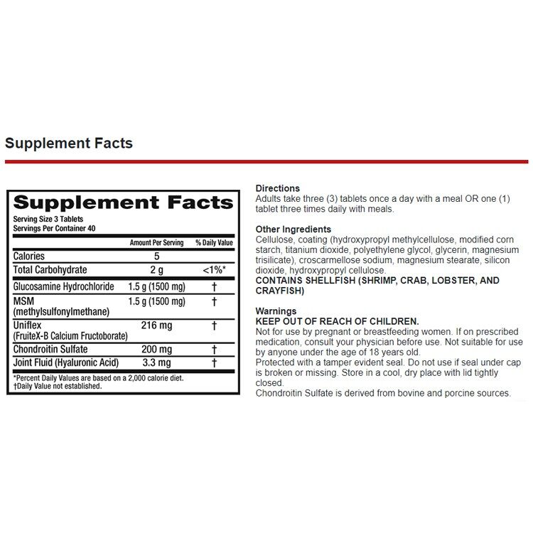 Move Free Advanced + MSM is a Glucosamine Chondroitin joint supplement that supports 5 signs of joint health (mobility, flexibility, strength, lubrication and comfort) and provides extra cartilage support so you can do the things you love. Glucosamine is key for the formation of cartilage, an essential building block of your joints to support your mobility and flexibility. Chondroitin is a building block of cartilage that supports joint strength by helping to resist compression in the joint. In the body, Chondroitin functions by attracting fluid to joints to support cushioning and lubrication. Uniflex® (FruiteX-B® Calcium Fructoborate) is a clinically tested mineral complex that supports joint comfort in as little as 2 weeks1. Hyaluronic Acid (HA) is the same molecule found in healthy joint fluid. HA has been reported to support joint lubrication and smooth movement. As we get older, levels of HA tend to decrease. Methylsulfonylmethane (MSM) is a source of sulfur found in the body that is important in the formation of collagen in joints, collagen is a vital part of your joints because it supports the structure of cartilage.*