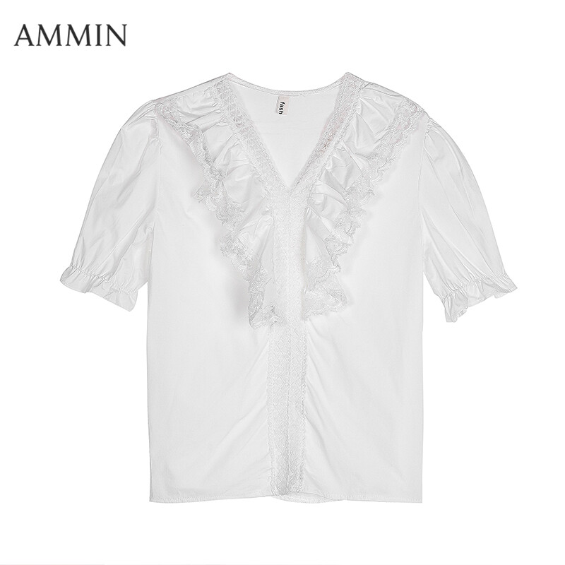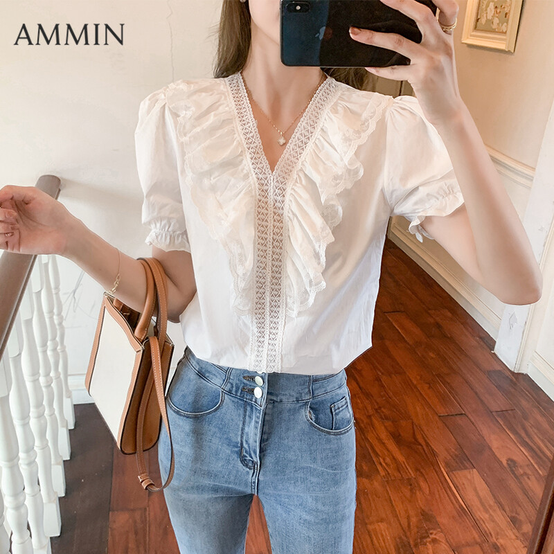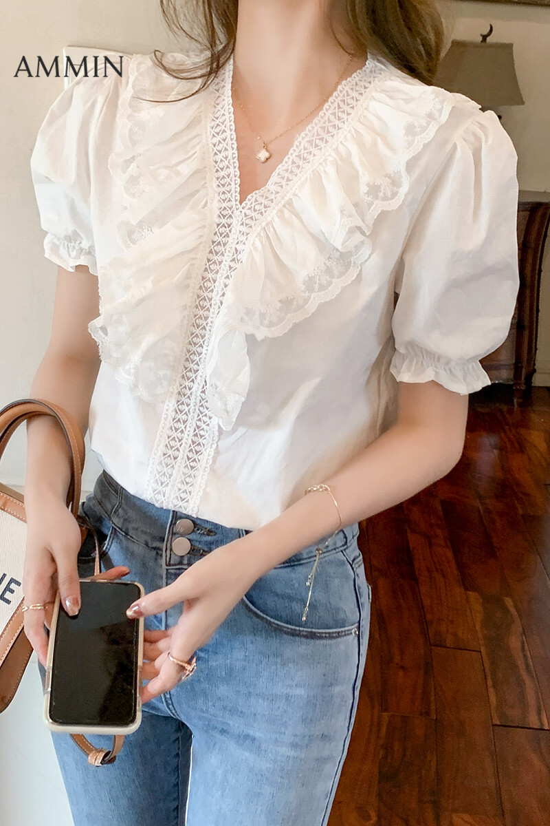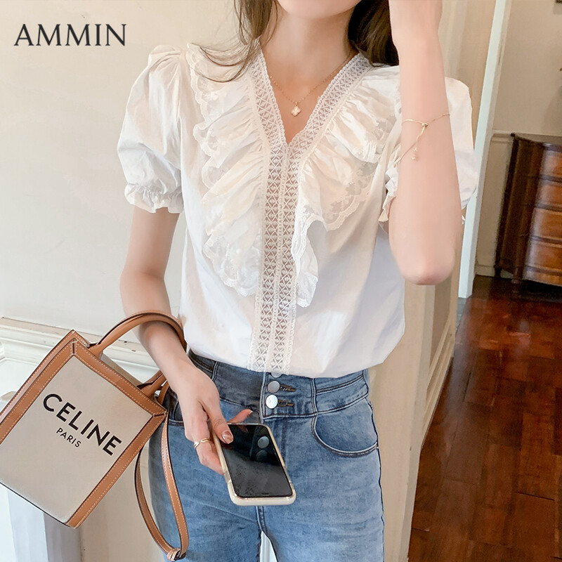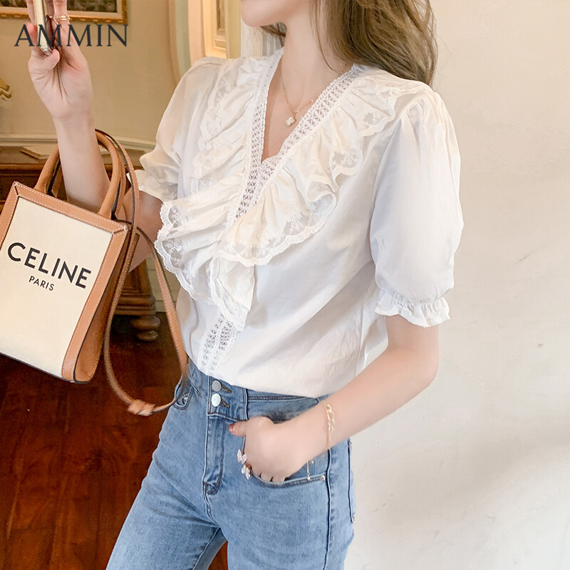 AMMIN Puff Sleeve Chiffon Lace Shirt For women Summer New Korean Style Loose V-neck Lace Top White Shirt Casual Blouse