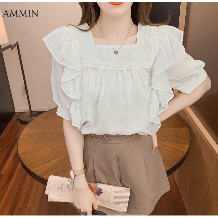 AMMIN Tops 2021 summer new style square neck puff sleeve embroidery hollow lace stitching blouse women's elegant temperament personality design French loose pleated ruffle stitching short style chiffo