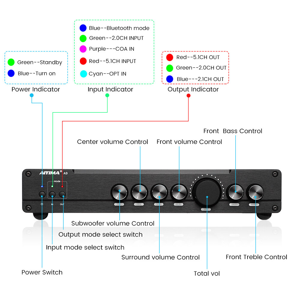 5.1 channel amp with professtional DSP decoding: A9 with built-in DSP decoding chip which applies professional algorithms and dynamic separation techniques, it auto allocates and simulates 2.1 and 5.1 channel and provide excellent smart noise reduction, precise sound positioning and stereo surrounded sense even though playing audio files of 2.0 channel.