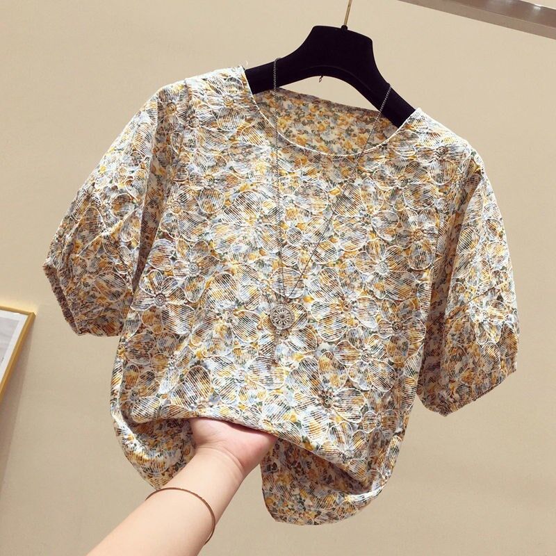 AFEG new Korean style round neck fashion loose and versatile printed short-sleeved blouse for women