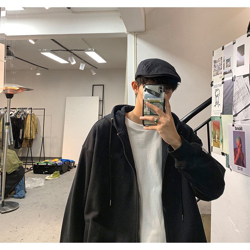 Thin Solid Color Men's Hooded Cardigan Sweater Spring and Autumn Trendy Ins Loose Casual All-matching Top Zipper Coat