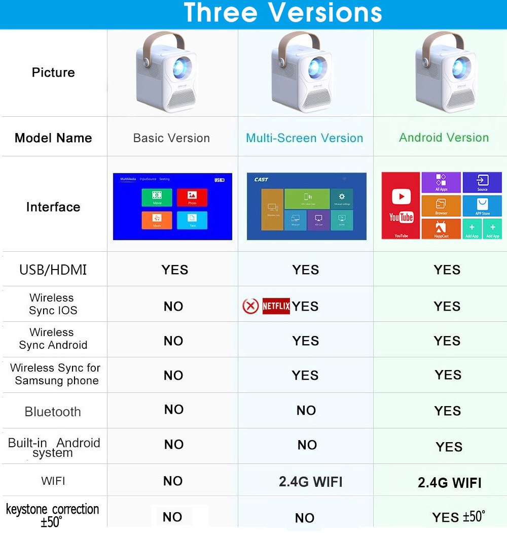 • Resolution 1920x1080p physical resolution • LED projector/built-in battery (optional). •Android 9.0 OS. Pre-installed NETFLIX, YOUTUBE •Support wireless sync display with Android phone /iphone •Support WiFi & Bluetooth function•Support vertical +-40°,Support Horizontal+-40° • Hermetically sealed optical engine engine