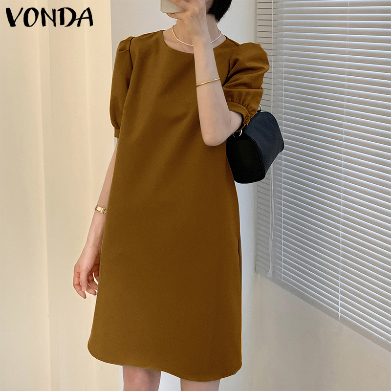 VONDA Women Summer Solid Color O Neck Casual Loose Knee-length T-shirt Dress (Korean Causal)