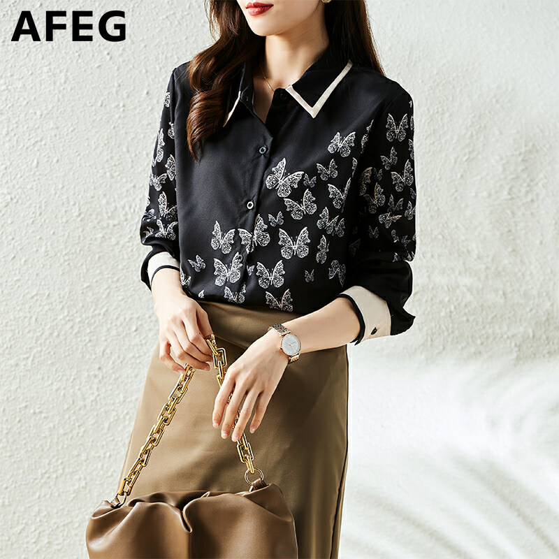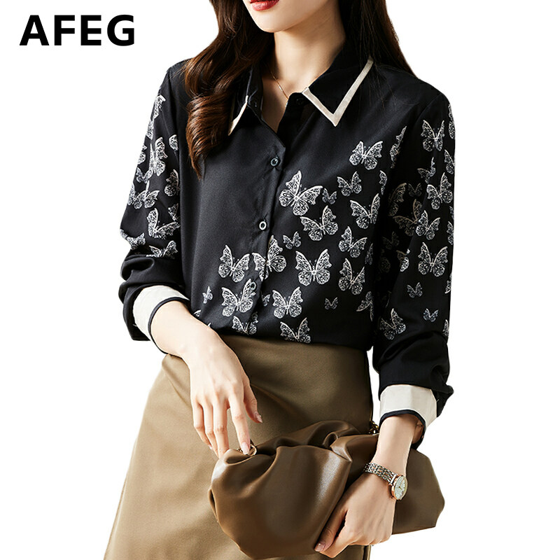 AFEG New Korean Style Fashion Loose Versatile Butterfly Print Chiffon Long Sleeve Blouse for women