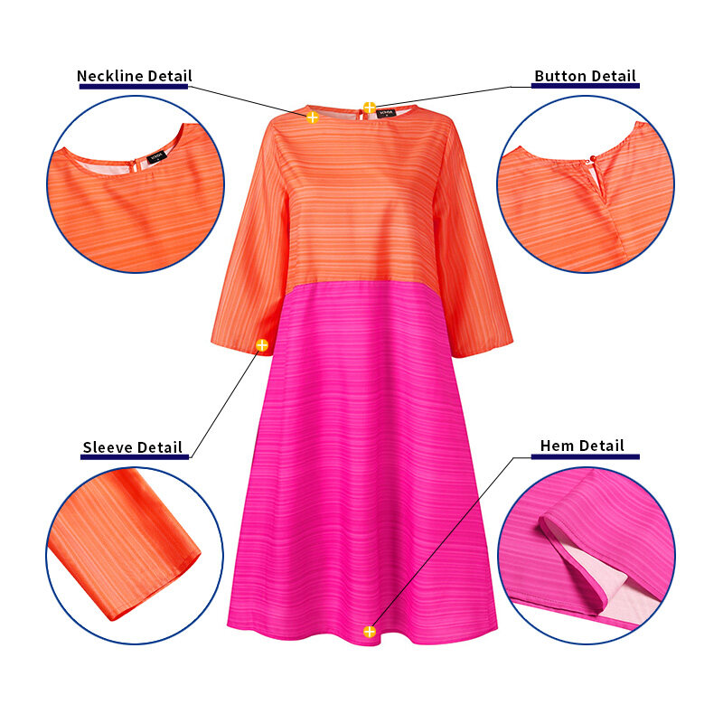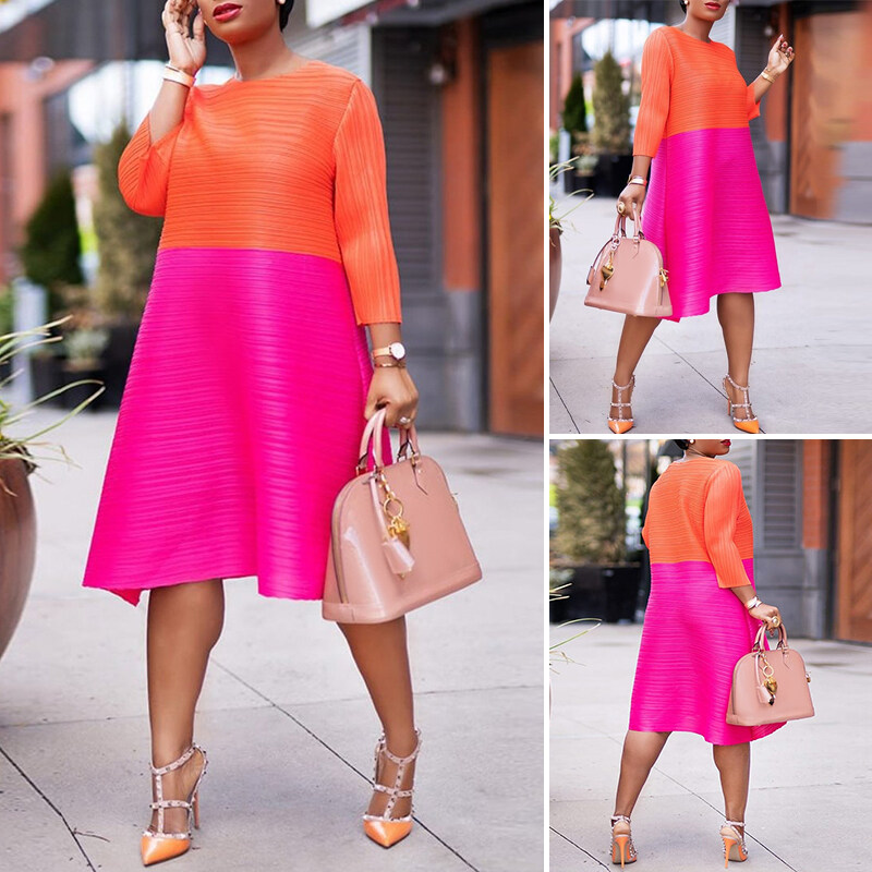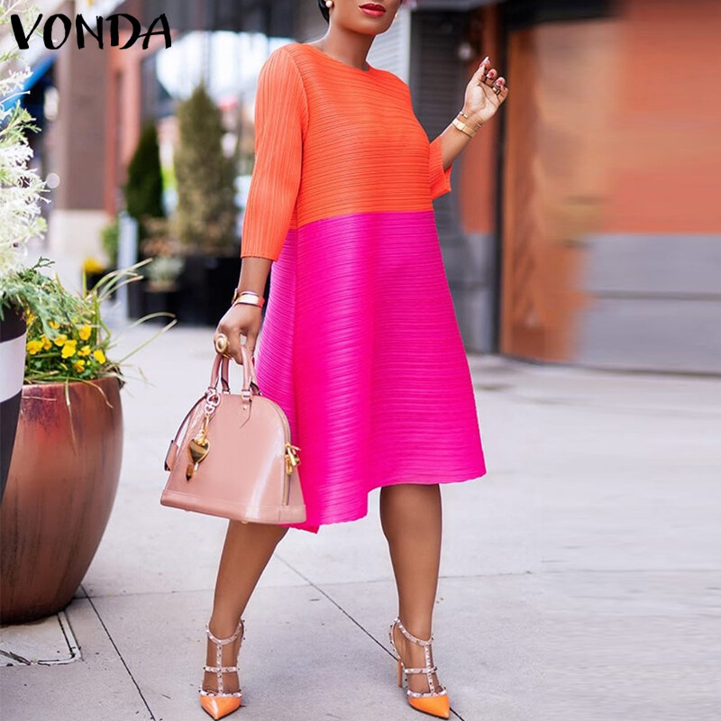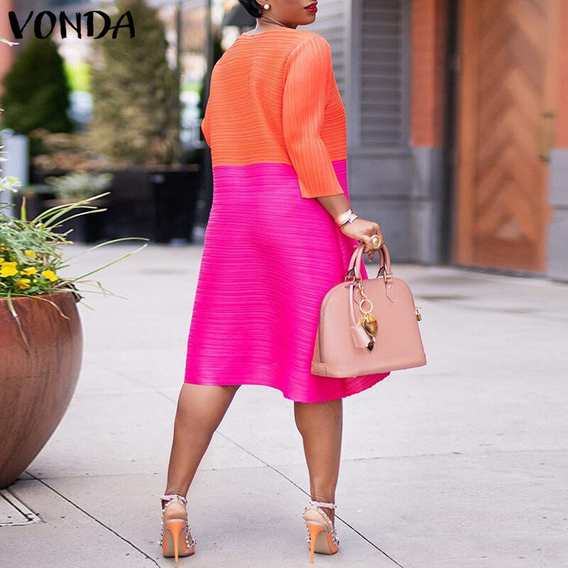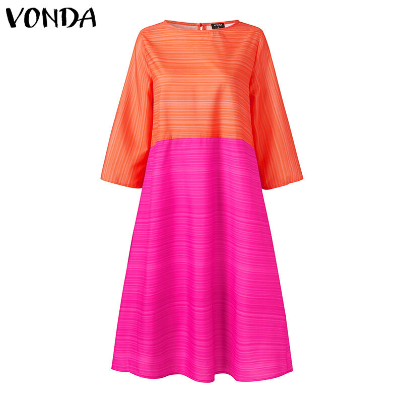 VONDA Women 3/4 Sleeve O Neck Solid Color Patchwork Midi T-Shirt Dress Casual Loose Holiday Dress (Plus Size)