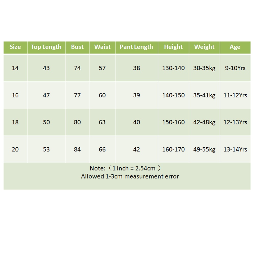 Drop-shipping/Re-seller/Wholesale are welcome!Follow us for more discount!Gender: BoysAge:9-14 YearsMaterial: 85% Nylon+ 15% Spandex14#:Top Length 43cm,Bust 74cm,Waist 57cm,Pant Length 38cm,Height 130-140cm,Weight 30-35kg,Age 9-10Yrs16#:Top Length 47cm,Bust 77cm,Waist 60cm,Pant Length 39cm,Height 140-150cm,Weight 35-41kg,Age 11-12Yrs18#:Top Length 50cm,Bust 80cm,Waist 63cm,Pant Length 40cm,Height 150-160cm,Weight 41-48kg,Age 12-13Yrs20#:Top Length 53cm,Bust 84cm,Waist 66cm,Pant Length 42cm,Height 160-170cm,Weight 49-55kg,Age 13-14YrsPackage include:1*set(Top+Pants+Hats)Remark :1.Please allow 1cm-3cm error measurement error.2.Please check the size chart first before you choose size for your baby.Care Instructions: Machine Wash and Hand Wash, you can wash it before your baby wear it.Notes:Due to the difference between different displays, the picture may not reflect the actual color of the item, please understand.Important :When you take an order, please make sure that your deliver information all are corrects as below:1.Correct contact name.2.Correct address3.Correct zip code4.Correct telephone or cellphone number.Best wishes!
