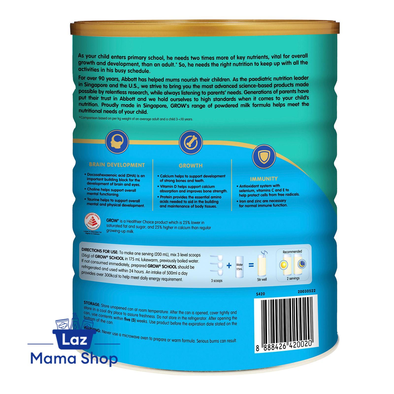 Abbott GROW milk powder for school-going children is formulated to provide essential nutrients to support their overall growth and development. GROW School is scientifically formulated to support the nutritional needs of your child in their formative years. Brain Development: DHA is an important building block for the development of brain and eyes. Growth: Calcium helps to support development of strong bones and teeth. Vitamin D helps support Calcium absorption and improves bone strength. Immunity: Antioxidant system with Zinc, Vitamins C and E to help protect cells from free radicals. Iron and Zinc are necessary for normal immune function. Unique vegetable fat blend with No Palm Oil. GROW is a Healthier Choice product which is lower in saturated fat and higher in calcium.
