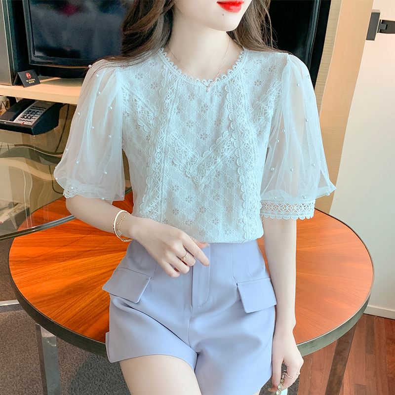 YIGE Round neck beaded lantern sleeves fashion lace blouse 2022 summer new Korean version tunic top