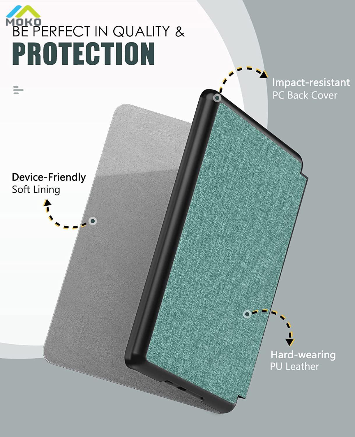 Product description: Slim lightweight hardback adds minimal bulk while protecting your Kindle Paperwhite 11. Automatically wakes or puts your device to sleep when the lid is opened and closed. The premium PU leather boosts a classy look. The no-scratch microfiber interior adds comfort and an additional layer of protection. Access to all controls and features. Device can be charged with case closed.