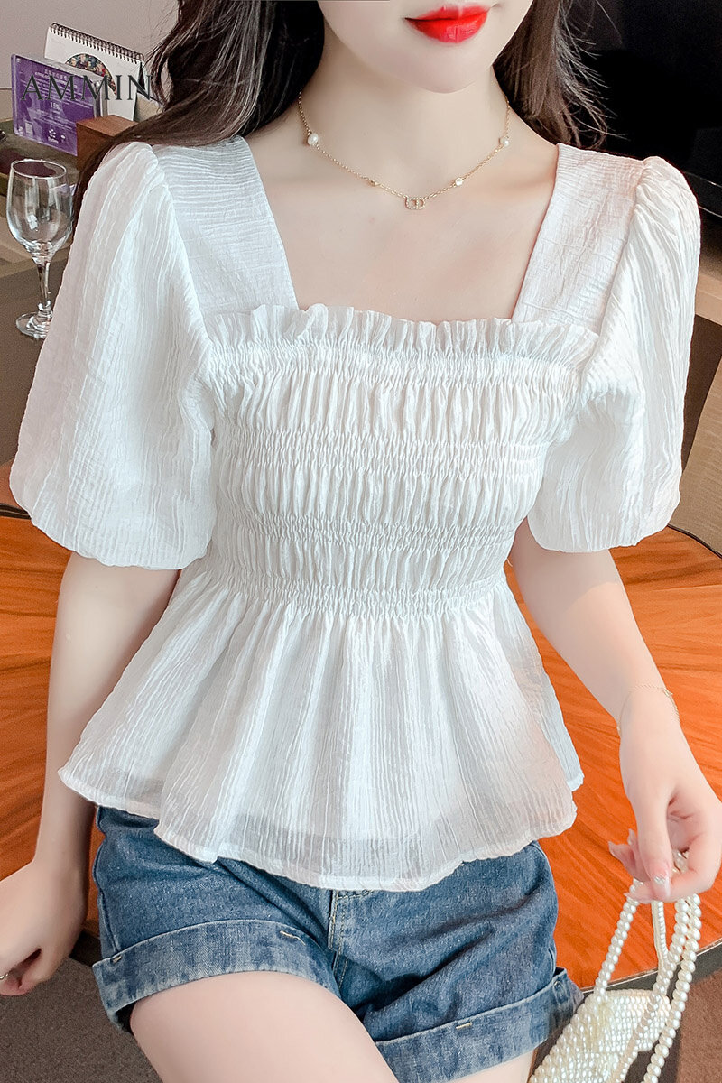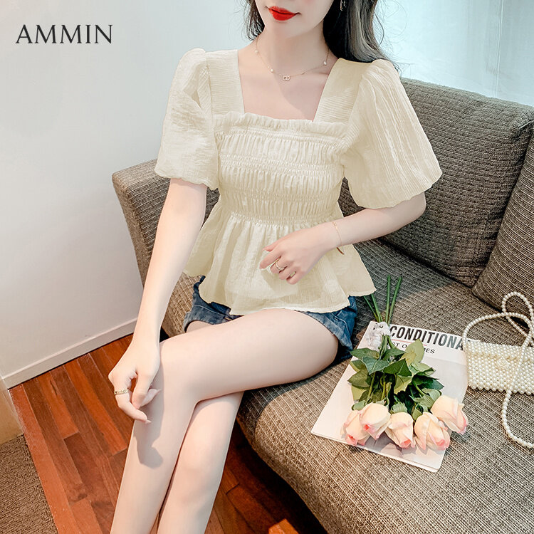 AMMIN 2022 summer new retro temperament square neck puff sleeve chiffon shirt Korean style fashion temperament waist thin chiffon Top doll shirt casual blouse For women