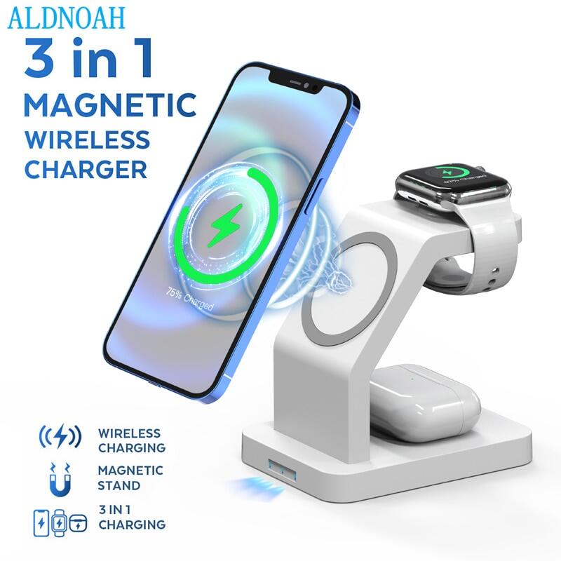 1. 【3 In 1】The magnetic three-charging bracket can simultaneously charge mobile phones, earphones and watches to solve the charging problem of multiple devices in one stop.