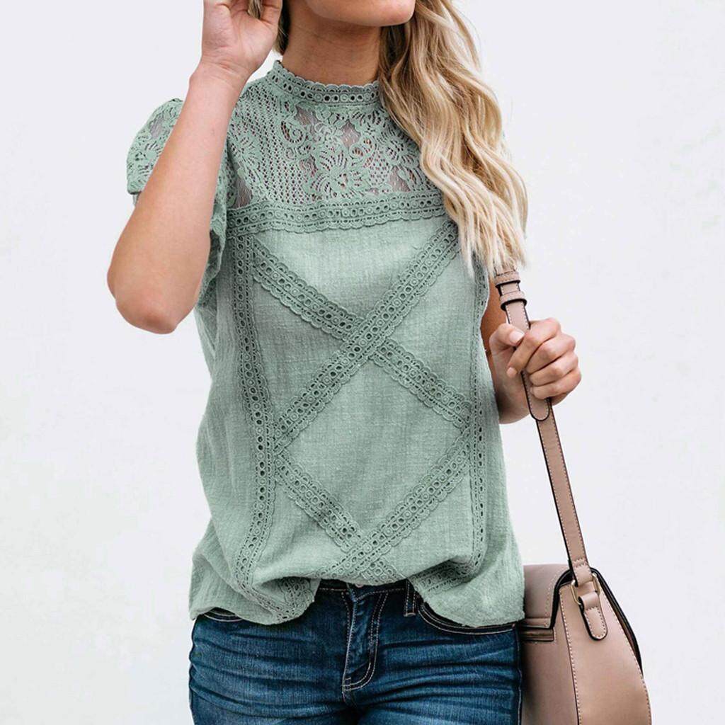Womens Lace Patchwork Flare Ruffles Short Sleeve Cute Cotton Shirt Blouse Top