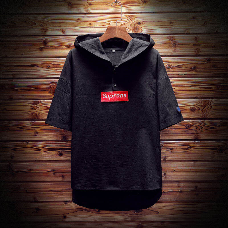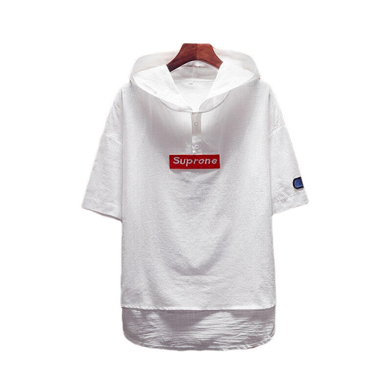 Japanese Applique Men's Summer Short Sleeve Sweater Men's plus Size Washed Cotton Hooded Half Sleeve Fashion Man T-shirt