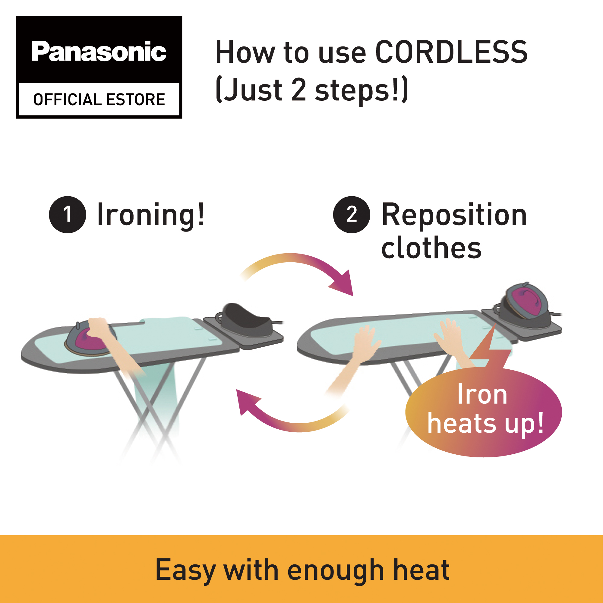 Reposition the clothes on the ironing board. Meanwhile, the base heats up the iron immediately, so you can continue ironing as long as necessary.