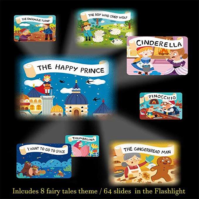 【TELL STORY TO KIDS】There are 8 fairy tales Movies include 64 Slides photos in the Flashlight,turn on the Flashlight and tell a story to your kid,playing like a child reading a picture book. everyone in the family can enjoy themselves before going to bed and take baby to a gentle sleep.Through the cute image and story,