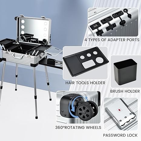 【LARGE CAPACITY】- Cosmetic organizer featuring 4 removable trays with a 40 Slots Sponge, along with an item divider, brush holder, and detachable hair tool holder, creating a versatile and spacious cosmetic storage solution. 【PREMIUM MATERIALS】- The rolling makeup station consists of a premium aluminum alloy frame and fireproof plate shell, while PVC lining enhances compression and impact resistance, ensuring durability.