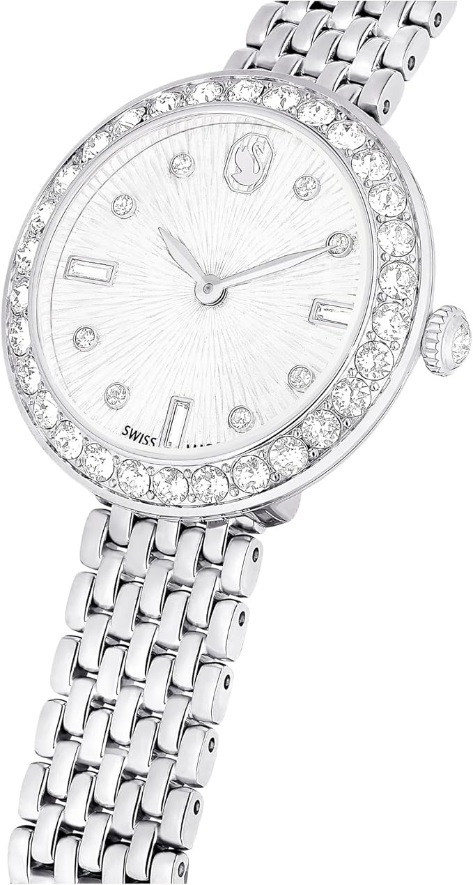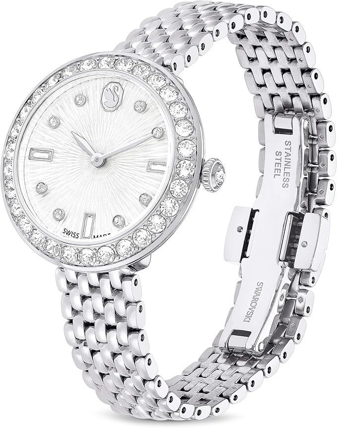 Shimmering Style: Featuring a stainless steel case with a sparkling crystal pavé bezel and a single crystal in the crown, this timepiece sparkles in a way that only Swarovski pieces can